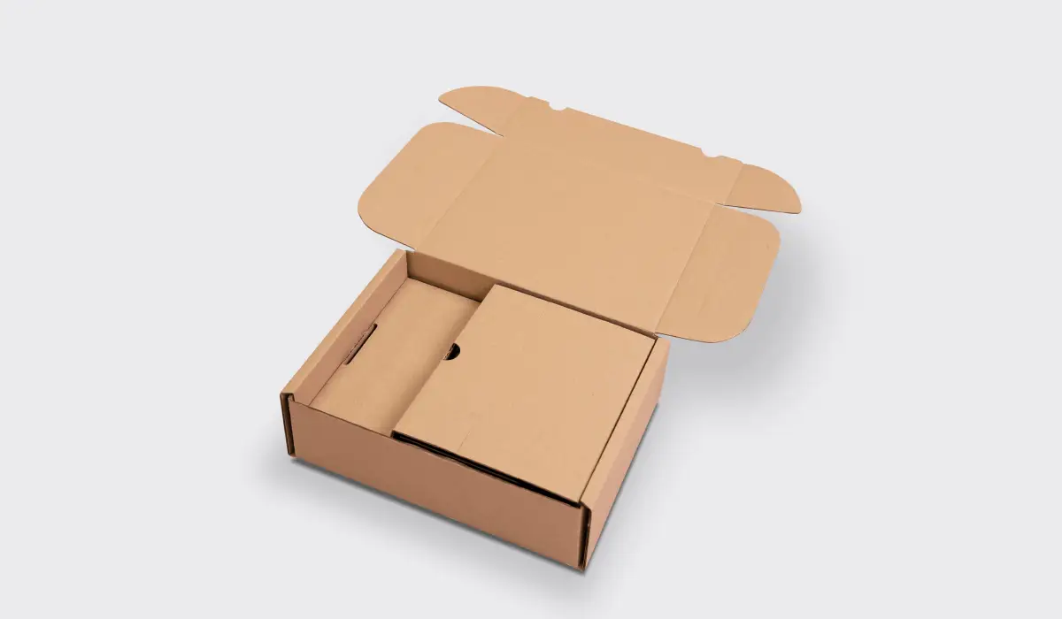 Základ jsme postavili na konstrukčně běžné hnědé poštovní krabici se zásuvnými klopami. To je typ obalu, který se rychle skládá, uzavírá bez lepicí pásky a hodí se pro opakované použití (při vrácení stačí znovu zasunout klopy).