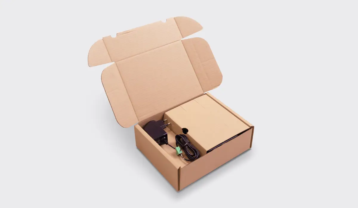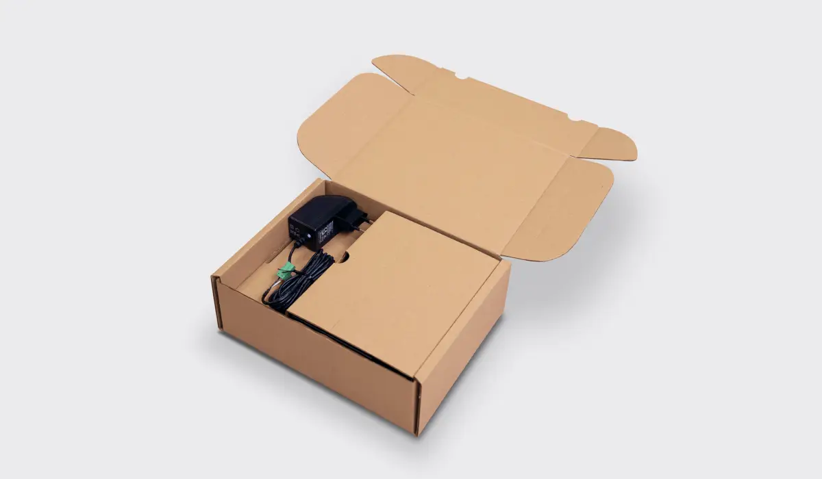 Vnější krabička i fixační vložka jsou z vlnité lepenky. Není potřeba žádná plastová fixace, žádné „bubliny“, žádné pěny. Zákazník tak po rozbalení řeší jen papír – a buď obal znovu použije pro vrácení, nebo ho jednoduše vytřídí. (A díky tomu, že jde o jeden materiál, je třídění snadné i pro laiky.)